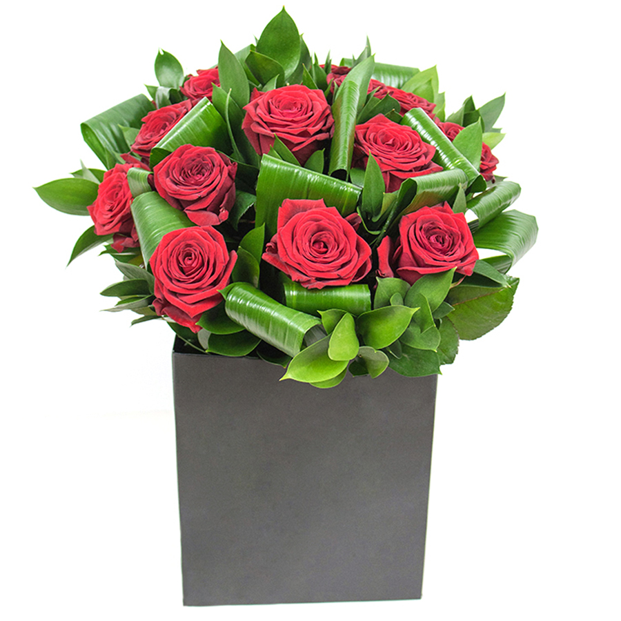 Enhance your home’s elegance with our stunning bouquet of vibrant red roses, paired with rich aspidistra leaves and graceful ruscus. This unique design offers a perfect blend of beauty and style.